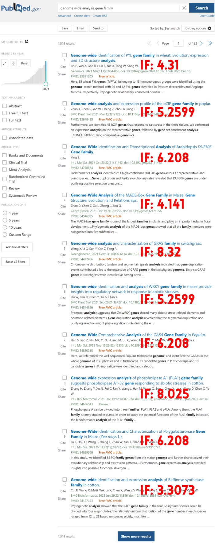 我們統(tǒng)計在2021年發(fā)表了1319篇相關(guān)的基因家族文章,而2022年到目前已經(jīng)發(fā)表了1241篇(使用genome wide of gene family關(guān)鍵詞檢索)??梢钥吹交蚣易逦恼逻@種套路文章發(fā)文之大。且如果進化做的好,可以分析一個基因家族在多個物種中演化規(guī)律,即可發(fā)更高水平的文章。