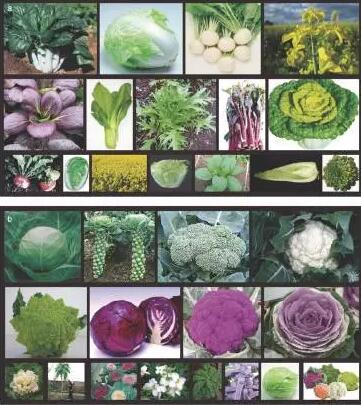蕓薹屬包括三個二倍體物種:蕓薹(Brassica rapa)、黑芥(B. nigra)和甘藍(B. oleracea),這三個基本種經(jīng)過兩兩雜交又產(chǎn)生了四倍體的歐洲油菜(B. napus)、非洲油菜(B. carinata)和芥菜(B. juncea),這就是“禹氏三角”。隨著人工馴化和持續(xù)的育種工作,這些物種產(chǎn)生了高度多樣化的形態(tài)型,例如結成球狀的葉片、膨大的塊莖(或根 部、頂芽、腋芽等)。有意思的是,某些物種的形態(tài)型,盡管是在不同的地區(qū)獨立培育而成,但卻表現(xiàn)出相似的表型特征,這便是趨同馴化的結果。