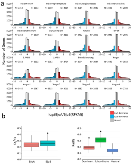 由于芥菜基因組是異源四倍體,也就是說基因組中存在兩套非常相似的亞基因組,那么在基因表達的過程中,位于兩套亞基因組上的等位基因的表達模式是怎么樣的呢,是一起表達,是相互抑制,還是一方占主導(dǎo)?