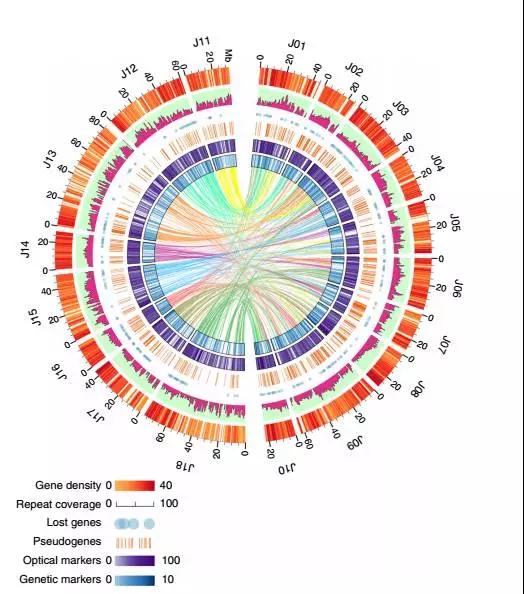 然后利用遺傳圖和光學(xué)圖譜對(duì)A、B亞基因組進(jìn)行區(qū)分,整體掛載效果非常好,A為91.48%,B為72.32%。利用光學(xué)圖譜和遺傳圖譜對(duì)基因組進(jìn)行區(qū)分,為其他多倍體物種基因組研究提供了參考。