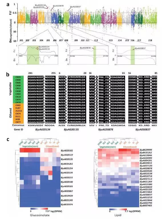 通過菜用和油用芥菜群體進(jìn)行選擇清除分析,發(fā)現(xiàn)dominance的基因被篩選出來(lái)的比例較高,同時(shí)結(jié)合轉(zhuǎn)錄組數(shù)據(jù),這部分基因在油用和菜用兩個(gè)群體中差異表達(dá)。同時(shí)通過上面的分析發(fā)現(xiàn)與硫苷,脂類代謝顯著相關(guān)并且存在dominance的基因組,這些基因在油用菜用群體中有各自獨(dú)特基因分型。