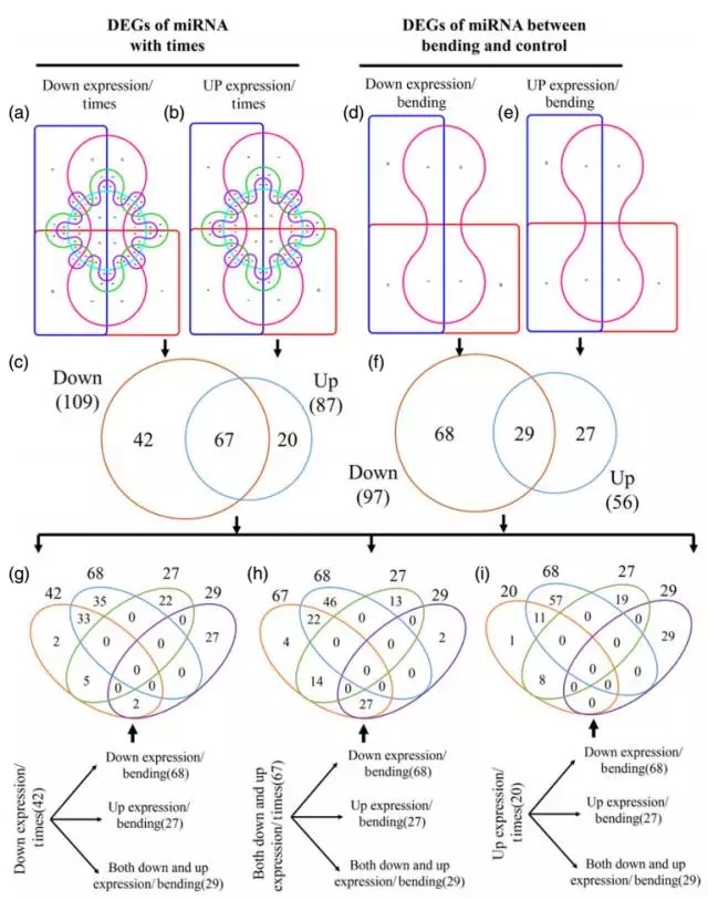對(duì)同一處理不同發(fā)育時(shí)期樣品間(CMS vs CES, CLS vs CMS, CLS vs CES, BMS vs BES, BLS vs BMS and BLS vs BES)篩選了差異表達(dá)miRNA并繪制了維恩圖。結(jié)果顯示,其中42個(gè)miRNA下調(diào)表達(dá),20個(gè)miRNA上調(diào)表達(dá)。對(duì)不同處理相同發(fā)育時(shí)期樣品間(BES vs CES, BMS vs CMS and BLS vs CLS)篩選到124個(gè)差異表達(dá)miRNA,相對(duì)對(duì)照組,嫩枝彎曲處理組中68個(gè)下調(diào)表達(dá),27個(gè)上調(diào)表達(dá)。