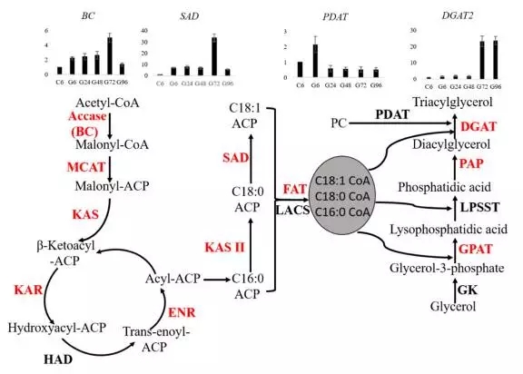 藻類和植物中脂肪酸的生物合成主要在葉綠體中進(jìn)行。乙酰-CoA作為合成的起始物質(zhì)?;谵D(zhuǎn)錄組測(cè)序,小球藻質(zhì)體中脂肪酸合成基因被鑒定到。在葡萄糖處理情況下,這些基因大都表達(dá)量上調(diào)。另外這次測(cè)序結(jié)果中還發(fā)現(xiàn)幾個(gè)基因?qū)?yīng)的不同轉(zhuǎn)錄本。由于BC和SAD是脂肪酸合成的限速酶基因,做了進(jìn)一步分析,發(fā)現(xiàn)BC和SAD表達(dá)量從6h到72h表達(dá)量持續(xù)上升,對(duì)應(yīng)的三酰甘油含量從24h到96h持續(xù)增加。