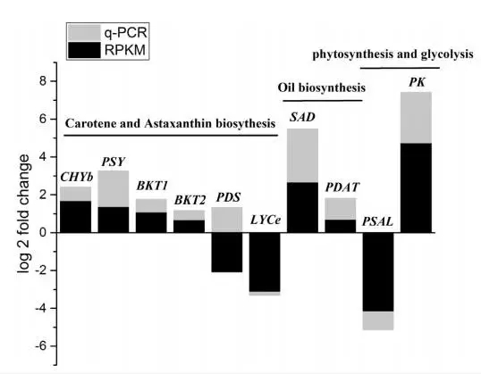 作者選了10個(gè)與蝦青素和三酰甘油合成有關(guān)的unigenes進(jìn)行了RT-PCR驗(yàn)證,其中9個(gè)基因的表達(dá)趨勢(shì)與RNA-seq結(jié)果一致。只有PDS兩種結(jié)果不同,可能是RNA-seq結(jié)果不準(zhǔn)確,因?yàn)榍叭说难芯砍晒校咸烟鞘巧险{(diào)PDS表達(dá)的,與本文中RT-PCR結(jié)果一致。