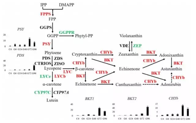在轉(zhuǎn)錄組測(cè)序結(jié)果中,發(fā)現(xiàn)MEP通路中的8個(gè)基因都被鑒定到,但是在MVA通路中只有2個(gè)基因被檢測(cè)到,其中HMG表達(dá)不顯著,ACAT表達(dá)量下降。這些結(jié)果表明小球藻中蝦青素的合成通路中IPP和DMAPP是MEP通路合成的。其中,發(fā)現(xiàn)一個(gè)可能編碼β-胡蘿卜素激酶(BKT2)與數(shù)據(jù)庫(kù)中的BKT1比對(duì)率僅為56%。功能分析發(fā)現(xiàn)BKT2可以轉(zhuǎn)化β-胡蘿卜素成為角黃素。下圖為蝦青素合成通路圖。在葡萄糖處理情況下,與蝦青素合成相關(guān)的6個(gè)基因上調(diào)差異表達(dá)。在小球藻中,葡萄糖誘導(dǎo)蝦青素的合成,伴隨著BKT1,CHYb,PDS在24h內(nèi)上調(diào)表達(dá)。為研究轉(zhuǎn)錄組水平基因表達(dá)量與產(chǎn)物含量的關(guān)系,分析了5個(gè)限速基因的表達(dá)量,這些基因在葡萄糖處理72h或92h表達(dá)量達(dá)到最高,相應(yīng)的,蝦青素的積累量也在96h達(dá)到穩(wěn)定水平。