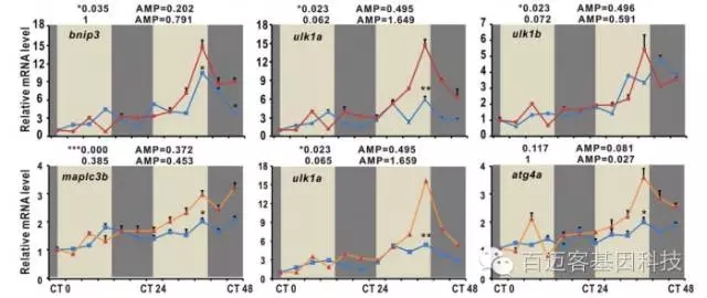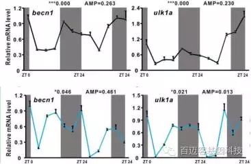 選取了幾個以前研究過的與自噬體形成、移動、延伸、融合、降解有關(guān)的基因進行RT-PCR分析,如maplc3b,bnip3,becn1等。材料為受精后72-96小時的斑馬魚幼體和肝臟材料。由圖可見這些基因都表現(xiàn)出明顯的生物鐘節(jié)律。圖中白色底色表示白天,灰色底色表示黑夜。