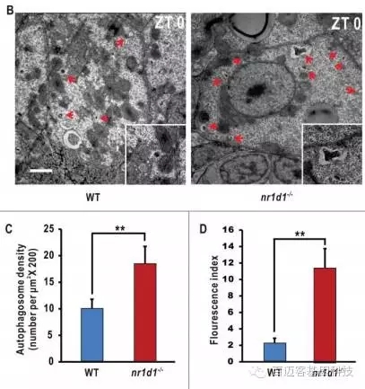 用TEM觀察WT和nr1d1突變斑馬魚肝臟中的自噬體數(shù)量,研究表明自噬體數(shù)量在nr1d1中明顯高于WT。