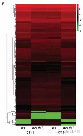 為了進一步說明nr1d1基因的功能,文章選取了野生型WT和nr1d1突變型斑馬魚進行轉(zhuǎn)錄組研究,并且取了2個時間點(CT2和CT14)。研究表明在CT2階段兩者有975個差異表達基因,在CT14階段有1360個差異表達基因。與WT相比,在nr1d1突變體中上調(diào)的基因數(shù)量要大于下調(diào)的基因數(shù)量。