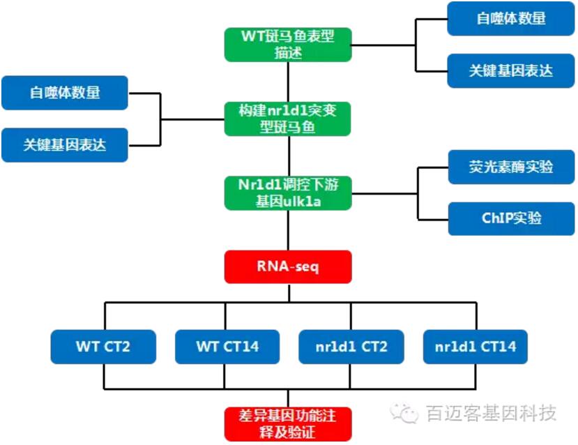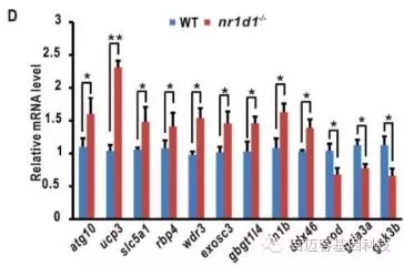 通過研究WT野生型和nr1d1突變型斑馬魚的基因表達情況,表明Nr1d1基因在生物鐘調(diào)節(jié)和細胞自噬過程中起著重要作用。生物鐘相關(guān)基因直接受Nr1d1調(diào)控。此外,通過轉(zhuǎn)錄組分析表明Nr1d1還調(diào)控脅迫、代謝、信號傳導(dǎo)、翻譯后修飾等生理過程。