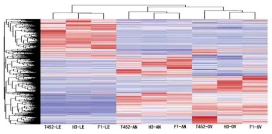 因?yàn)門452和H3的雜交F1代表現(xiàn)出了優(yōu)良性狀,因此可以通過轉(zhuǎn)錄組測序研究性狀差異的原因。取T452,H3及雜交F1代的三種不同組織分別進(jìn)行轉(zhuǎn)錄組測序,包括減數(shù)分裂階段的花藥、減數(shù)分裂階段的子房、開花階段的旗葉??偣矞y了548M clean reads,平均有89.06%的reads可以比對到參考基因組上,其中93.45%都是比對到唯一位置上。三個(gè)生物學(xué)重復(fù)之間的相關(guān)性都達(dá)到了0.8以上。用qRT-PCR的方法對12個(gè)差異表達(dá)基因(DEG)的表達(dá)量進(jìn)行了驗(yàn)證,結(jié)果與轉(zhuǎn)錄組測序的結(jié)果一致。對不同樣品進(jìn)行層次聚類分析表明,相同組織的樣品總能聚到一塊(圖2)。