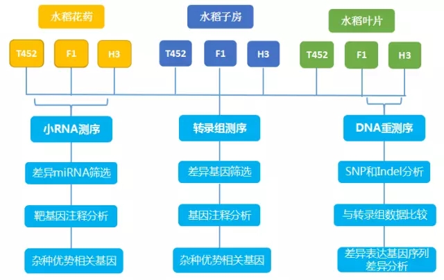轉(zhuǎn)錄組測序:取T452,H3及雜交F1代的三種不同組織分別進(jìn)行轉(zhuǎn)錄組測序,包括減數(shù)分裂階段的花藥、減數(shù)分裂階段的子房、開花階段的旗葉。每個(gè)組織每種品系有3個(gè)生物學(xué)重復(fù),共27個(gè)樣品。測序平臺(tái)為Illumina HiSeq 2500,平均每個(gè)樣品測約5G。
