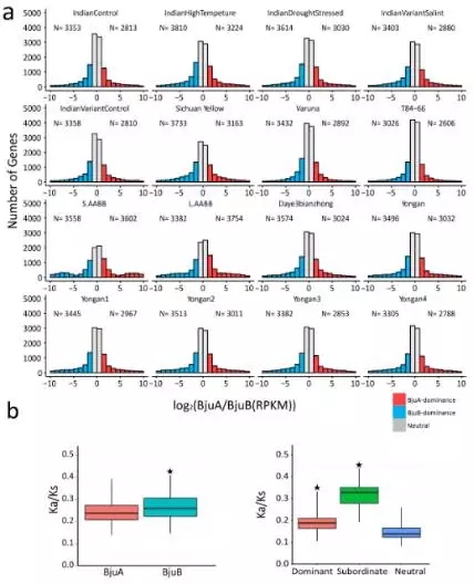 由于芥菜基因組是異源四倍體,也就是說基因組中存在兩套非常相似的亞基因組,那么在基因表達(dá)的過程中,位于兩套亞基因組上的等位基因的表達(dá)模式是怎么樣的呢,是一起表達(dá),是相互抑制,還是一方占主導(dǎo)?