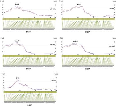 共定位到了26個和珍珠品質(zhì)相關(guān)的QTL,分別位于第1,4,8,14,15和17號連鎖群上,PVE范圍為8.45%-22.8%。在1號連鎖群上定位到3個殼寬QTLs,在第1和第15號連鎖群上分分別定位到1個控制殼重的QTL。第8號染色體上定位到體重相關(guān)的7個QTL,另外,作者也定位到了大量其他性狀的QTL。同時對第17號染色體上的4個和貝殼珍珠層顏色相關(guān)的QTL進(jìn)行簡單的統(tǒng)計驗證。