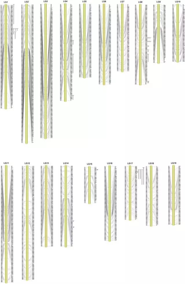 作者之前利用SSR標(biāo)記做的遺傳圖譜和利用SLAF-seq構(gòu)建的遺傳圖譜進(jìn)行了比較。兩張遺傳圖譜均構(gòu)建了珍珠蚌19條連鎖群,但是標(biāo)記數(shù),圖距,分辨率均不同。SSR標(biāo)記包含了506個標(biāo)記,總圖距1,922.3cM,平均圖距3,99cM,大的Gap數(shù)較多,而基于SLAF-seq的圖譜在以上指標(biāo)上均顯著優(yōu)于SSR標(biāo)記圖譜。