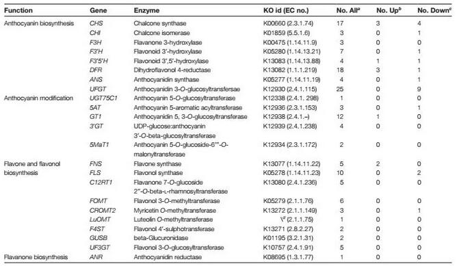 通過轉(zhuǎn)錄組和代謝組技術(shù),不僅可以對轉(zhuǎn)錄水平進(jìn)行研究,還可以對代謝產(chǎn)物進(jìn)行比較分析,從而深入解析決定表型的分子調(diào)控機(jī)制。本研究首次使用轉(zhuǎn)錄組和代謝組聯(lián)合分析,揭示與風(fēng)信子花色素沉著相關(guān)的主要代謝途徑,并且挖掘針對植物中色素沉積相關(guān)的關(guān)鍵基因。