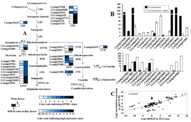 通過將藍(lán)色和白色風(fēng)信子花青素顏色代謝相關(guān)關(guān)鍵基因比較分析,顯示出了與一般研究相反的結(jié)果,即在白色風(fēng)信子花中,大部分花青素合成相關(guān)的uni-transcripts表達(dá)豐度高于在藍(lán)色花中的表達(dá)。進(jìn)一步研究發(fā)現(xiàn),在白色花瓣提取物中檢測到大量的類黃酮化合物,其中許多與花青素共享相同的中間體或酶。這可能是花青素含量與葡萄風(fēng)信子花色苷生物合成基因表達(dá)量不相關(guān)的主要原因。最后,選擇花色相關(guān)基因qRT-PCR驗(yàn)證,驗(yàn)證測序結(jié)果的準(zhǔn)確性。