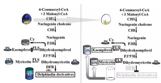 在藍(lán)色風(fēng)信子中檢測到與Del合成相關(guān)的部分同源序列的表達(dá)上調(diào),在某些情況下,高出> 1000倍。結(jié)合HPLC分析結(jié)果,DFR可能是白色葡萄風(fēng)信子中藍(lán)色色素沉積(Del)消失的靶基因。另外,F(xiàn)LS和DFR在共同的二氫楊梅素底物之間的強(qiáng)烈競爭,可能部分地阻斷Del的合成并引起其他類黃酮化合物,如楊梅素的產(chǎn)生,由此進(jìn)一步消除白色風(fēng)信子中藍(lán)色色素沉積。