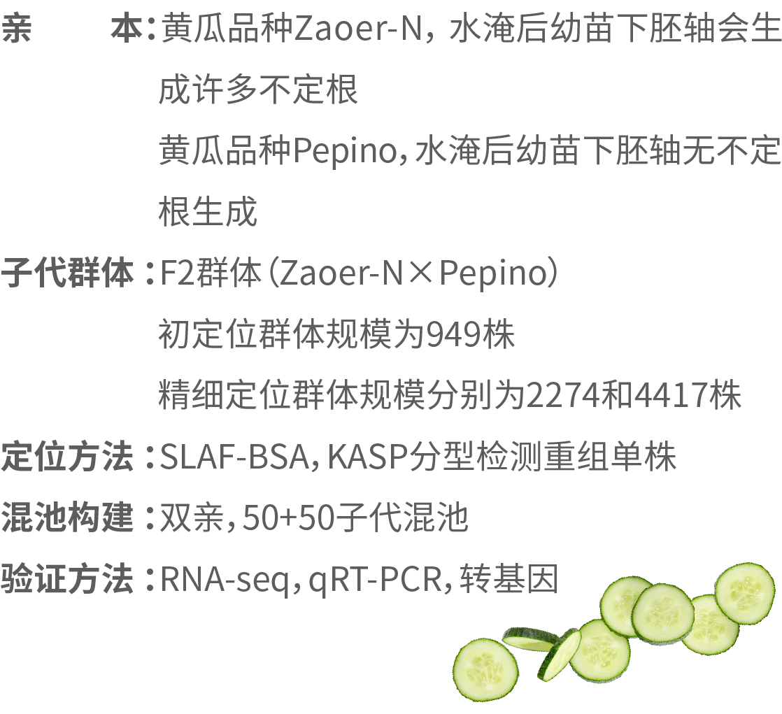 黃瓜是重要的蔬菜品種,其根生長(zhǎng)淺,對(duì)氧氣需求較為嚴(yán)格,這造成它對(duì)水淹脅迫非常敏感。在水淹脅迫下,黃瓜下胚軸通過產(chǎn)生不定根來獲取氧氣,以適應(yīng)水淹脅迫。為解析水淹脅迫下黃瓜不定根生產(chǎn)現(xiàn)象的遺傳學(xué)機(jī)制,研究者曾利用耐水淹材料Zaoer-N 和不耐水淹材料Pepino構(gòu)建的群體進(jìn)行QTL定位,已經(jīng)分離了一個(gè)控制不定根數(shù)目的主效QTL ARN6.1,該QTL在多年的實(shí)驗(yàn)均解釋了較高的表型貢獻(xiàn)率。本研究將對(duì)該QTL進(jìn)行精細(xì)定位,確定引起性狀差異的基因,并進(jìn)行多方面的驗(yàn)證。