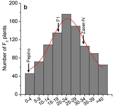 表型觀察發(fā)現(xiàn),水淹處理7天后,Zaoer-N幼苗下胚軸生長(zhǎng)出許多不定根,而Pepino幾乎沒有(圖1);通過對(duì)F2群體表型統(tǒng)計(jì),所有子代的不定根數(shù)目表現(xiàn)出正態(tài)分布,這也說明了該性狀為數(shù)量性狀(圖2)。另外,對(duì)F2群體的949個(gè)個(gè)體進(jìn)行水淹耐受力評(píng)估打分,發(fā)現(xiàn)不定根數(shù)目與水淹耐受力之間呈顯著正相關(guān),皮爾森相關(guān)系數(shù)為0.72(P = 0.05),這表明不定根數(shù)目可以作為衡量水淹耐受力的可靠指標(biāo)。