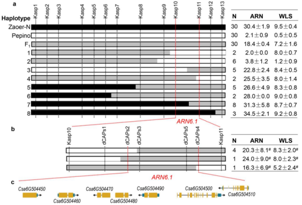 利用定位區(qū)間側(cè)翼SLAF標(biāo)記(SLAF_marker_192310和SLAF_marker_192096)上的SNP,分別各開發(fā)KASP標(biāo)記(KASP1和KASP13),并對(duì)2274個(gè)F2子代進(jìn)行分型,獲得33個(gè)重組個(gè)體;再在KASP1和KASP13之間開發(fā)11個(gè)KASP標(biāo)記,對(duì)33個(gè)重組個(gè)體進(jìn)行基因分型,共得到8種單倍型。結(jié)合重組個(gè)體基因分型和表型數(shù)據(jù),將ARN6.1定位到61.5kb的區(qū)間(KASP10和KASP11)(圖4a)。為進(jìn)一步縮小區(qū)間,利用KASP10和KASP11對(duì)4417個(gè)F2個(gè)體進(jìn)行分型,得到6個(gè)重組個(gè)體,這6個(gè)重組個(gè)體分別自交得到6個(gè)F2:3家系,然后利用新開發(fā)的5個(gè)dCAPS對(duì)F2:3家系進(jìn)行分型,結(jié)合所有表型數(shù)據(jù),最終將ARN6.1定位在36.1kb的范圍內(nèi)(圖4b)。對(duì)該區(qū)進(jìn)行注釋,共有7個(gè)基因(圖4c),有趣的是,其中5個(gè)基因都被預(yù)測(cè)為編碼AAA 型的ATP酶家族蛋白。