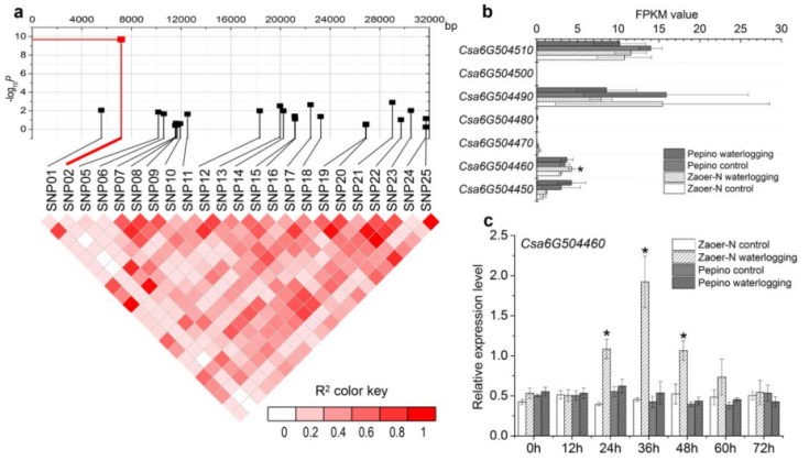 2個(gè)親本重測(cè)序分析,在36.1kb的區(qū)間內(nèi)開發(fā)到25個(gè)SNP,為確定哪個(gè)SNP與性狀真實(shí)相關(guān),研究者對(duì)100個(gè)黃瓜自交系的23個(gè)SNP(2個(gè)SNP只存在于Zaoer-N中而被過濾掉)進(jìn)行分型,結(jié)合每個(gè)自交系不定根數(shù)目的表型數(shù)據(jù)進(jìn)行局部關(guān)聯(lián)分析,結(jié)果顯示SNP02與表型有較強(qiáng)的關(guān)聯(lián)性。對(duì)SNP02分析發(fā)現(xiàn),其位于Csa6G504460的第二外顯子,可能就是引起變異的SNP位點(diǎn)(圖5a)。
