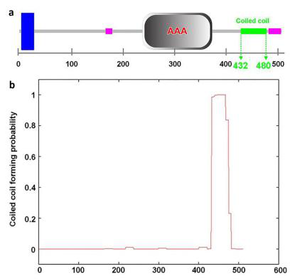 基因組和cDNA序列分析顯示,CsARN6.1擁有2個(gè)外顯子,被預(yù)測(cè)為編碼含有511個(gè)氨基酸殘基的AAA-ATPase結(jié)構(gòu)域蛋白,該蛋白中含有一個(gè)coiled-coil結(jié)構(gòu)域(圖6),前期關(guān)聯(lián)到的SNP02即位于該結(jié)構(gòu)域,由于該SNP的突變導(dǎo)致Asp被替換成Gly,Zaoer-N為CsARN6.1^Asp型,表現(xiàn)出較強(qiáng)的ATP酶活性,而Pepino為CsARN6.1^Gly型,幾乎沒有ATP活性(圖7)。