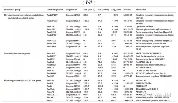 植物調(diào)控網(wǎng)絡(luò)中,轉(zhuǎn)錄因子有著舉足輕重的地位。結(jié)合轉(zhuǎn)錄因子預(yù)測和差異基因分析,發(fā)現(xiàn)了一批可能調(diào)控性別發(fā)育的轉(zhuǎn)錄因子。比如編碼PvoAMS和PvobHLH的基因分別下調(diào)了5.4和5.2倍,編碼PvoWOX9和PvoSUP 的基因在FIB中上調(diào)。由此可見,生長素、細(xì)胞分裂素、生長素能夠促進(jìn)花的性別分化為雌性,激素之間的相互作用和內(nèi)部穩(wěn)態(tài)平衡對(duì)花性別分化至關(guān)重要。