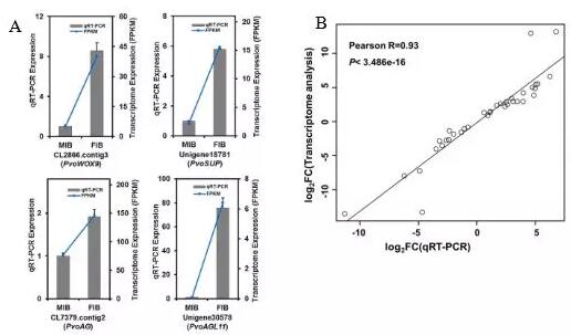 本研究中,挑選了36個(gè)基因用qRT-PCR驗(yàn)證,表達(dá)趨勢和轉(zhuǎn)錄組一致,且兩種數(shù)據(jù)的相關(guān)性達(dá)到0.93。