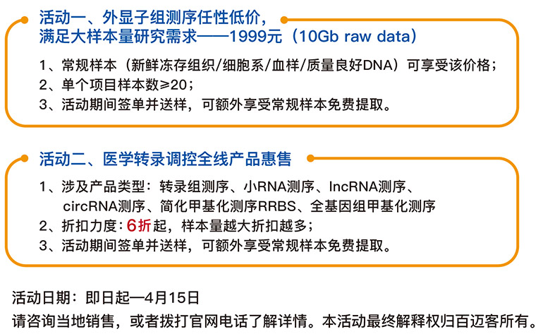 開學(xué)季,放禮季,百邁客醫(yī)學(xué)產(chǎn)品全線促銷活動(dòng)開啟。百邁客全外顯子組測(cè)序(10Gb/樣本,Q30>85%),主流外顯子捕獲平臺(tái)羅氏NimbleGen SeqCap EZ Exome Library V3和安捷倫 SureSelect Human All Exon V6,一律1999元/樣本?。ǖ饶銇韮旛r)