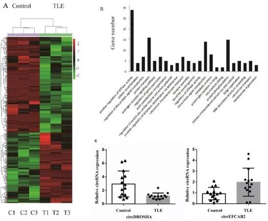 在本研究中,為了評估circRNA在人體內(nèi)的作用,作者采用了高通量測序方法,測定TLE患者和非TLE患者顳葉新皮質(zhì)中circRNA表達水平,并對環(huán)狀RNA的功能進行了注釋。作者描述了一個包含潛在基因與circRNA-miRNA的網(wǎng)絡(luò)。