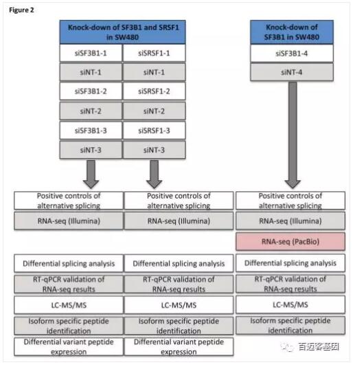 為了驗(yàn)證能通過splicify得到的isoform,同時(shí)增加新的轉(zhuǎn)錄本,Iso-seq被用于在SW480細(xì)胞中SF3B1的下調(diào)和siNT對照(如圖2所示)的檢測中。