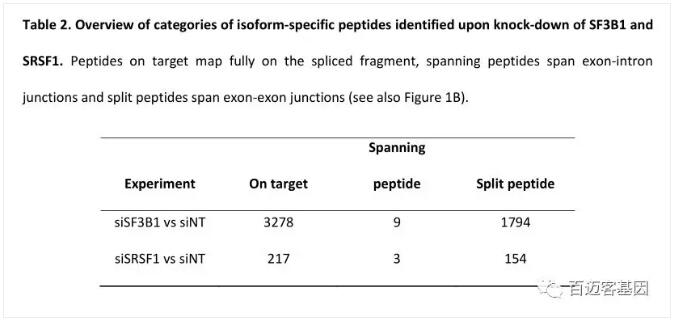 肽段數(shù)量上的差別直接和兩個(gè)實(shí)驗(yàn)剪接isoform數(shù)據(jù)庫的數(shù)目相關(guān)??偟膩碚f,大約60%的isoform特異肽段會(huì)比對到目標(biāo)區(qū)域,跨越exon-econ junction的split 肽段約占40%,跨越 exon-intron junctions 的spanning肽段則很少被發(fā)現(xiàn)(如表2所示)。