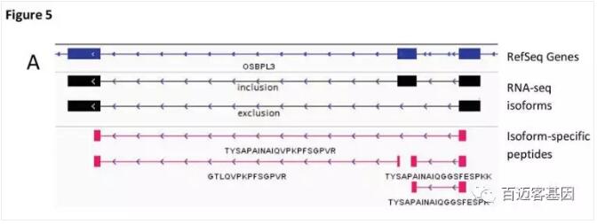 約65%的顯著差異表達(dá)的splice-specific-peptides在RNA水平上表現(xiàn)出一致的表達(dá)差異。例如,下調(diào)SF3B1的實(shí)驗(yàn)組中,OSBPL3 9號外顯子中分別有3個(gè)支持外顯子保留和1個(gè)支持外顯子去除的peptides被鑒定出來。兩種inclusion specific-peptides表達(dá)明顯較低,而exclusion specific -peptides則與對照相比表現(xiàn)出較高的表達(dá)量(如圖5所示)。