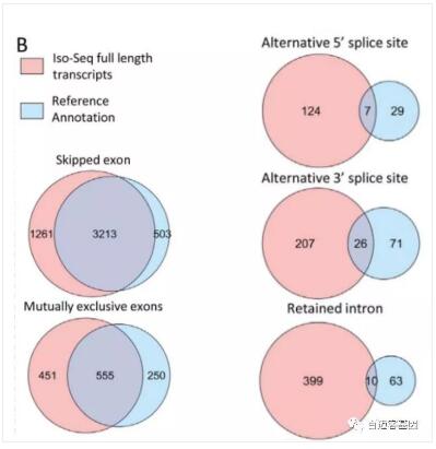 在研究可變剪接方面,Iso-Seq測到的全長轉(zhuǎn)錄本對基因組注釋結(jié)果是一個(gè)極大補(bǔ)充,尤其在內(nèi)含子保留、3 ‘可變剪接和5 ‘端可變剪接事件中,Iso-Seq測到的全長轉(zhuǎn)錄本與基因組注釋的重疊較小。這表明,基因組注釋中缺少一些完整的或部分的內(nèi)含子序列可變剪接的isoform形式。