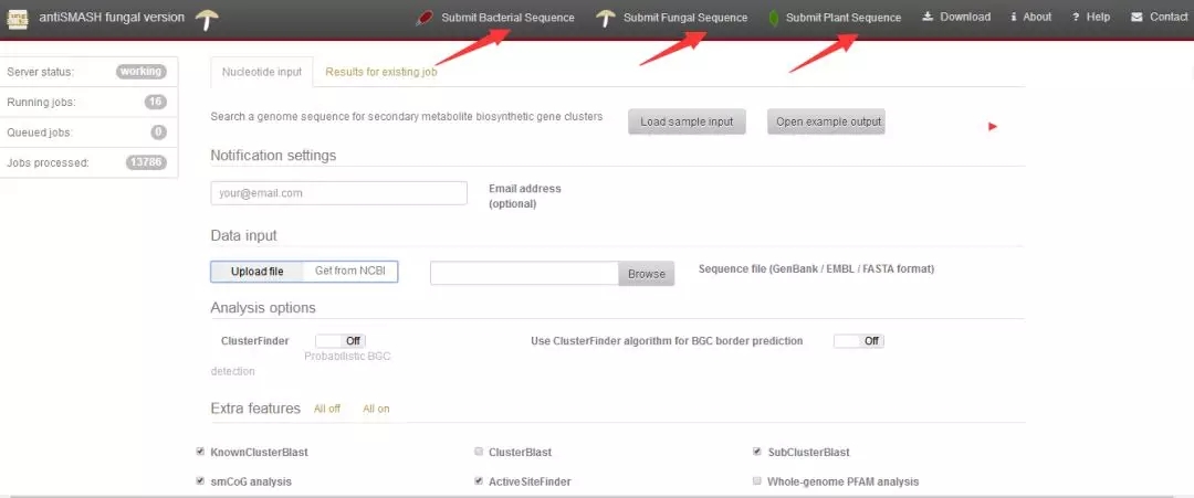 1.次級(jí)代謝產(chǎn)物預(yù)測(cè)網(wǎng)址:https://fungismash.secondarymetabolites.org ,點(diǎn)擊進(jìn)入界面,可進(jìn)行細(xì)菌、真菌以及植物次級(jí)代謝產(chǎn)物預(yù)測(cè);