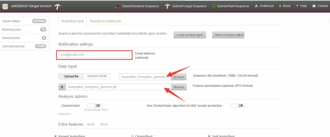 3.其他參數(shù)默認(rèn),點(diǎn)擊“submit”申請(qǐng)次級(jí)代謝產(chǎn)物預(yù)測(cè)結(jié)果,大約12h內(nèi),系統(tǒng)運(yùn)行結(jié)束后,預(yù)留郵件會(huì)收到預(yù)測(cè)結(jié)果;