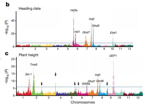 作者通過對1495份雜交稻品種材料中17套代表性雜交稻產(chǎn)生的10074 F2遺傳群體進行基因組測序和田間產(chǎn)量性狀考察,綜合QTL定位及GWAS分析,鑒定出了控制水稻雜種優(yōu)勢的主要基因位點HD3a、TAC1、LAX1、Ghd8等 。進一步研究表明,水稻中雜種優(yōu)勢的表現(xiàn)正是由這些基因位點所決定,在雜交配組中,這些基因位點產(chǎn)生了全新的基因型組合,在雜交一代中高效地實現(xiàn)了對水稻花期、株型、產(chǎn)量各要素的理想搭配。