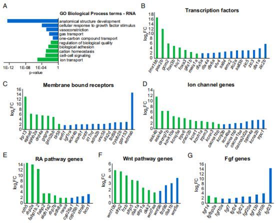 為了確定沿尾鰭近遠(yuǎn)端軸線差異表達(dá)的分子類型,因此對(duì)RNA-seq數(shù)據(jù)進(jìn)行了GO分析(圖2A)。轉(zhuǎn)錄因子是細(xì)胞識(shí)別的主要監(jiān)管者,因此是位置記憶效應(yīng)物的最佳候選者。在作者的RNA-seq數(shù)據(jù)中編碼轉(zhuǎn)錄因子的693個(gè)mRNA中,有53個(gè)在尾鰭前緣和末端區(qū)域差異表達(dá)(圖2B)。對(duì)應(yīng)于964個(gè)跨膜受體中的80個(gè)和222個(gè)離子通道蛋白中的55個(gè)的RNAs在近端和遠(yuǎn)端區(qū)域之間差異表達(dá)。這些命中包括谷氨酸和多巴胺可吸收G蛋白偶聯(lián)受體和幾個(gè)Ca2+和K+可滲透通道(圖2C和D)。此外,作者發(fā)現(xiàn)與先前不涉及生長(zhǎng)控制或再生的細(xì)胞信號(hào)傳導(dǎo)途徑相關(guān)的跨膜蛋白的差異表達(dá),如ephrin和ednrab。RA,WNT和FGF信號(hào)傳導(dǎo)等幾種途徑在附肢發(fā)育和再生期間已知在生長(zhǎng)控制和圖案化中的作用,這些信號(hào)通路分別包含55,52和41個(gè)基因,并確定了12個(gè)RA,13個(gè)WNT和10個(gè)FGF信號(hào)傳導(dǎo)途徑基因相反的轉(zhuǎn)錄梯度(圖2E-G)。