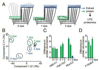 為了檢驗(yàn)這種預(yù)測(cè),分別于截肢后1、3天(dpa),在blastema形成期和生長(zhǎng)期(圖4A)對(duì)再生鰭的片段進(jìn)行LFQ蛋白質(zhì)組學(xué)研究。為了減少魚類之間的潛在變異,作者從同一條魚中采集了再生鰭的背側(cè)和腹遠(yuǎn)端區(qū)域(雙截肢)。作者發(fā)現(xiàn)3061種蛋白質(zhì)中有97種、11種和2種在0,1和3dpa的背側(cè)和腹側(cè)-遠(yuǎn)側(cè)位置之間差異表達(dá)。在再生過程中不同時(shí)間蛋白質(zhì)表達(dá)的PCA顯示1和3dpa的樣品聚集成不同的組,在近端或遠(yuǎn)端區(qū)域之間幾乎沒有變化,而在未損傷的鰭(0dpa)中近端和遠(yuǎn)端區(qū)域之間存在更多變異(圖4B)。然而,在1dpa差異表達(dá)的11種蛋白中,6種在未受損魚鰭(0dpa)中也差異表達(dá)。編碼這些蛋白質(zhì)的三個(gè)基因aldh1l1,hsd17b7和muc5.2(圖4C)也通過RNA-seq測(cè)量發(fā)現(xiàn)在未受傷的鰭片中差異表達(dá)。UniProt ID F1R4E4的一種無特征蛋白質(zhì),是唯一在0,1和3dpa差異表達(dá)的蛋白質(zhì)(圖4D)。