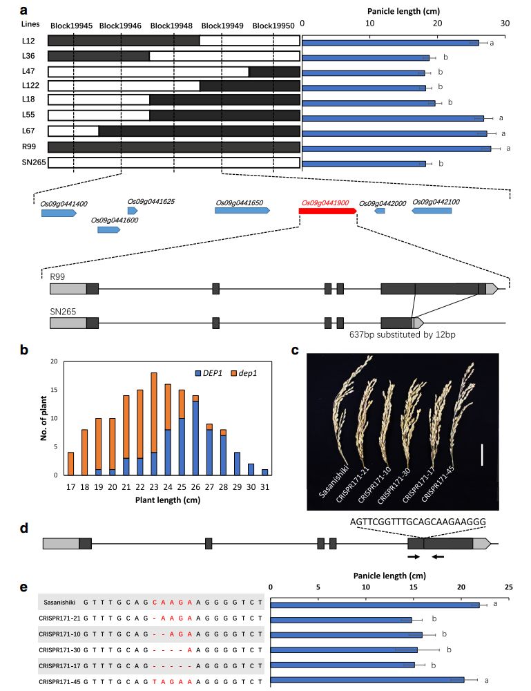 為了確定QTL簇的候選基因,進(jìn)一步做了基因的精細(xì)定位。首先,關(guān)注的是chr9上的 qPL9簇,候選基因被定位在43kb的區(qū)間內(nèi),其中包含7個(gè)注釋基因,通過序列比對(duì)分析發(fā)現(xiàn)一個(gè)候選基因DEP1上的exon5中存在堿基序列的替換,即R99中637bp的片斷在SN265中被替換成12bp的序列;接著共分離分析發(fā)現(xiàn)SN265型的dep1具有明顯短于R99的穗長(zhǎng)(圖5)。為了證明DEP1qPL9的候選基因,利用 CRISPR/Cas9技術(shù)對(duì)Sasanishiki品種中的DEP1基因誘變,獲得五個(gè)突變體株系,其中四個(gè)突變體發(fā)生移碼突變,呈現(xiàn)短穗長(zhǎng),另外一個(gè)突變體產(chǎn)生兩個(gè)氨基酸的替換,其穗長(zhǎng)與Sasanishiki無顯著性差異(圖5),暗示DEP1qPL9簇中控制穗長(zhǎng)的基因。