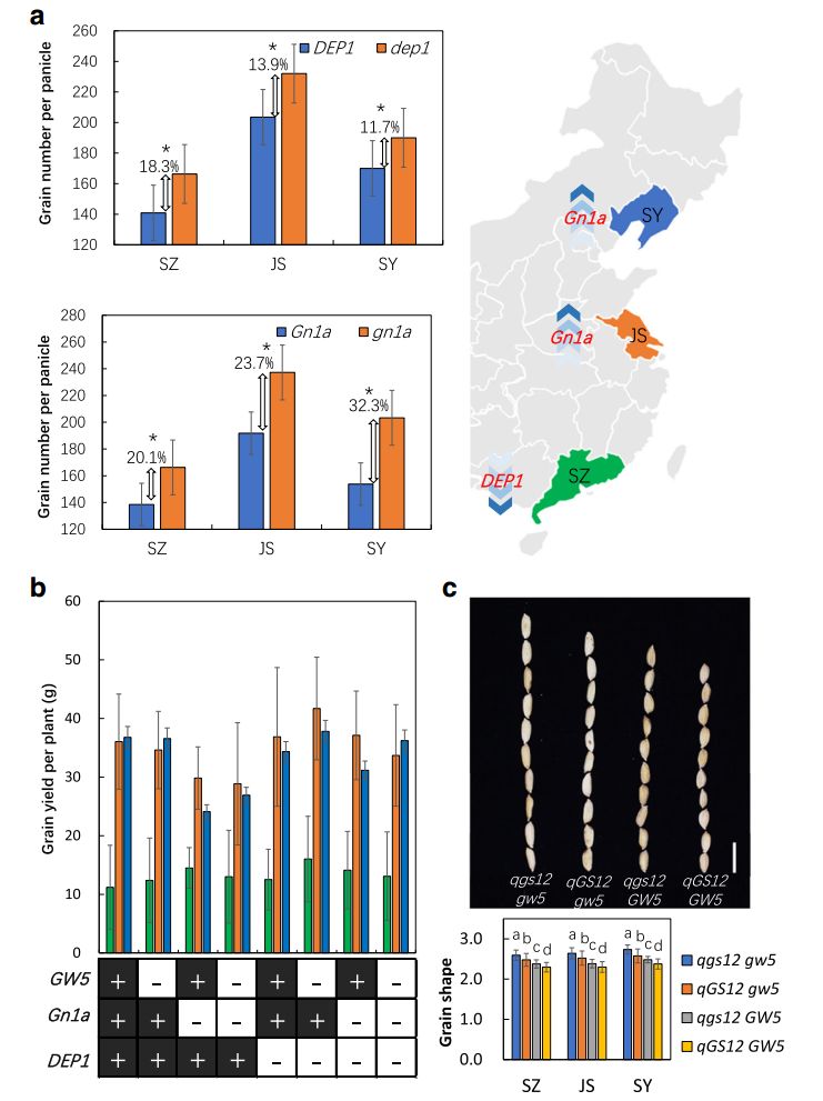 為了揭示生態(tài)環(huán)境與遺傳背景對(duì)基因功能的影響,首先,作者發(fā)現(xiàn)Gn1a對(duì)水稻單穗籽粒數(shù)目的貢獻(xiàn)主要集中在江蘇與沈陽兩個(gè)實(shí)驗(yàn)點(diǎn),而DEP1僅僅在深圳被檢測(cè)到是控制單穗籽粒數(shù)目的QTL(圖6)。對(duì)以上三個(gè)種植區(qū),又進(jìn)一步比較攜帶有 DEP1/dep1與Gn1a/gn1a的不同水稻材料,結(jié)果發(fā)現(xiàn)在高緯度生態(tài)區(qū)dep1對(duì)單穗籽粒數(shù)目的貢獻(xiàn)減少,而gn1a對(duì)其貢獻(xiàn)明顯增強(qiáng)(圖6)。類似地,DTH8、 SDG708與PHYB在江蘇均被檢測(cè)到,而PHYB在深圳也被檢測(cè)到,同樣, DTH8、 SDG708在沈陽也被檢測(cè)到;結(jié)果顯示DTH8、SDG708幾乎不會(huì)影響在深圳的抽穗期,PHYB在沈陽有較弱的作用(圖6)。概括起來,Gn1a、 SDG708、SD1與GW5的功能在高緯度地區(qū)被增強(qiáng),另一方面,PHYB與DEP1的功能隨著緯度的北移被破壞,有趣的是,DTH8在中緯度地區(qū)具有較強(qiáng)的功能,緯度的南移或北移都會(huì)削弱其功能。