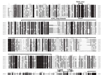 多重序列比對(duì)表明,硬骨魚(yú)和人的氨基酸高度保守。推導(dǎo)出的S.m-C4蛋白具有α-β連接子序列RXXR(在殘基668-671)和α-γ。連接序列RRXR(殘基1426-1429),其中C4氨基酸鏈被切割成三個(gè)鏈(α,β和γ鏈)。此外,保守的硫酯(GCGEQ)位點(diǎn)也定位在殘基1001至1005(圖5)。預(yù)測(cè)了TLR5由前21個(gè)氨基酸組成的信號(hào)肽和由14個(gè)氨基酸組成的跨膜螺旋。在膜結(jié)合型TLR5的LRR-CT中發(fā)現(xiàn)4個(gè)保守的半胱氨酸殘基,此外,還有9個(gè)蛋白結(jié)合區(qū)。結(jié)果表明,S.m-TLR5蛋白與銀大麻哈魚(yú)(91.5%)、大西洋鮭(91.7%)和衰白鮭(89.6%)的同源性較高,與鯉魚(yú)(48.1%)和金鯽(48.8%)的同源性較低。