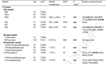 首先,利用位點(diǎn)模型探討C4基因中是否存在因其不同的分類(lèi)地位和生存環(huán)境而正向選擇的位點(diǎn)。在模型中,只有M1a-M2a和M7-M8能夠檢測(cè)到正向選擇位點(diǎn)。M7-M8檢測(cè)到PP > 0.95的10個(gè)正向選擇位點(diǎn),其中9個(gè)位點(diǎn)也被M1a-M2a檢測(cè)到,表明魚(yú)C4基因的正向選擇。其次,利用分枝模型來(lái)探究這些正向選擇事件是否發(fā)生在特定的魚(yú)類(lèi)譜系上,從而導(dǎo)致現(xiàn)在的魚(yú)或者祖先魚(yú)類(lèi)。最后,利用分枝位點(diǎn)模型,在特定的現(xiàn)在和祖先譜系中檢測(cè)了這些位點(diǎn)。對(duì)于C6基因,M7-M8在正選擇壓力下僅檢測(cè)到一個(gè)位點(diǎn),而花羔紅點(diǎn)斑鮭或其他冷水魚(yú)中的分支位點(diǎn)未檢測(cè)到任何正選擇位點(diǎn)(表8)。