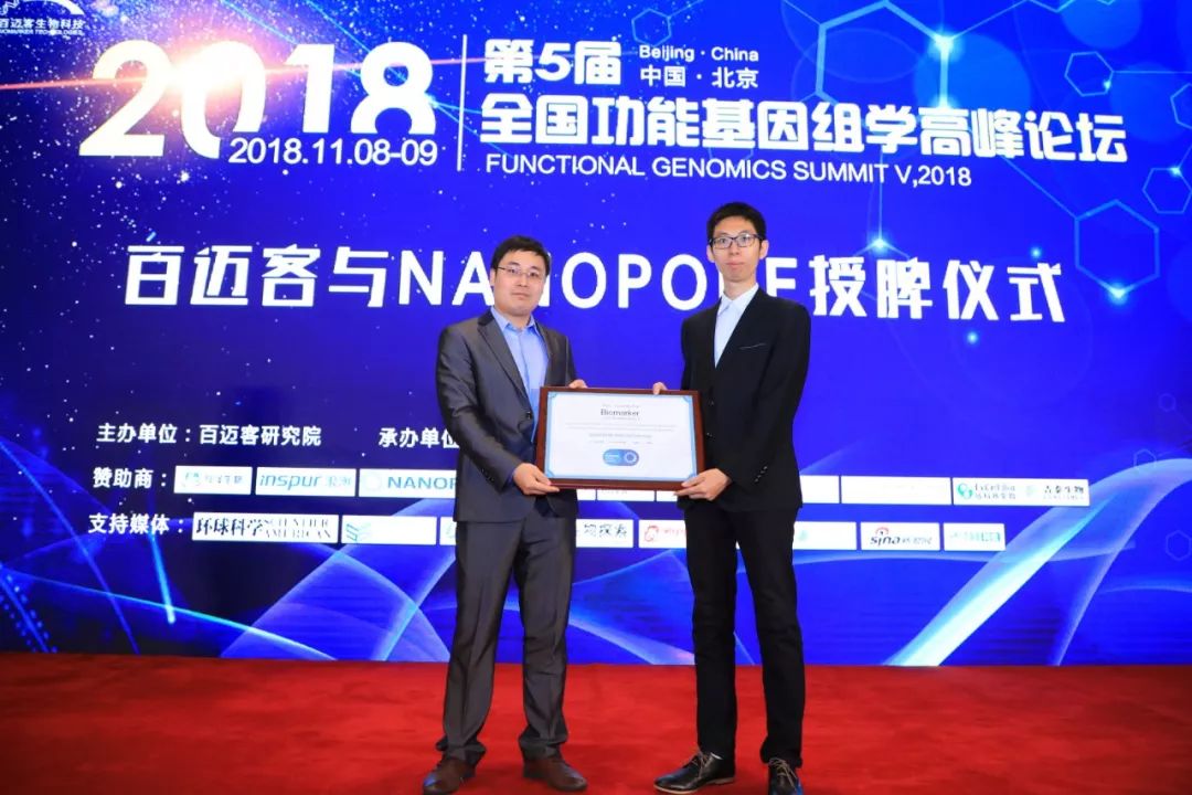 Nanopore官方人員預(yù)祝第五屆全國功能基因組學峰會圓滿成功,并確認百邁客已拿到官方的DNA、RNA測序資質(zhì),這也是中國大陸拿到Nanopore RNA測序資質(zhì)的公司。同時百邁客也與Nanopore官方代表舉行授牌儀式。