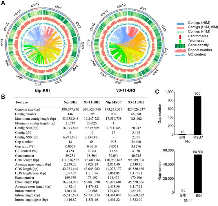 ? ? ? 利用PacBio對Nip和93-11進行測序及Illumina平臺進行g(shù)ap填充和誤差校正后,Nip基因組大小為380.7 Mb(contig N50=16.97Mb),93-11基因組大小為396Mb(contig N50=9.64Mb)。新組裝的Nip和93-11基因組的contig N50分別比先前公布的高2.2倍和460倍。與先前的參考基因組的比較顯示,新的組裝序列分別與之前公布的基因組有~98%的序列同一性。Nip中的gap數(shù)從905個大幅減少到18個,以及93-11中的gap從54600個減少到65個。PCR分析獨立驗證了Nip和93-11的所有染色體中隨機選擇的48個gap-closures。還糾正了93-11中幾個堿基的錯配,并通過PCR和Sanger測序進一步驗證。此外,基于串聯(lián)端粒重復(fù)序列的存在,大多數(shù)端粒位于染色體末端。新的基因組組合以及RNA-seq數(shù)據(jù)促進了基因注釋和基因間隔的改進。研究院分別糾正了Nip和93-11中的215和9843基因注釋錯誤,包括基因方向和基因結(jié)構(gòu)的糾正,并鑒定了一些新基因。啟動子區(qū)的注釋也被更新(圖1)。