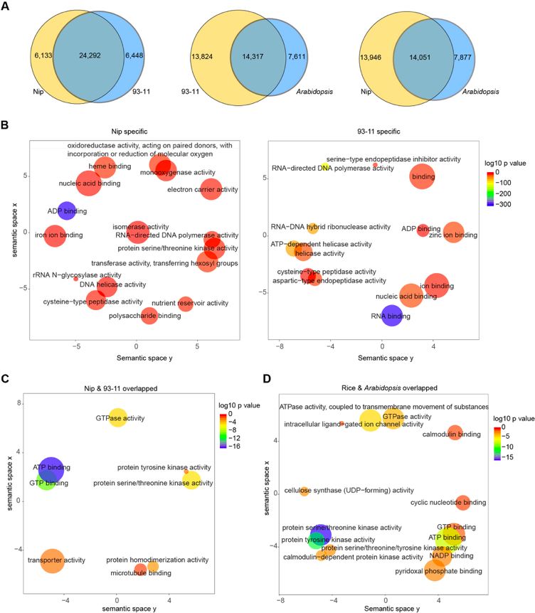 ? ? ??水稻Nip、93-11和擬南芥中6mA分布模式有幾個關(guān)鍵特征:6mA位點廣泛分布于所有染色體上,在著絲粒周圍異染色質(zhì)區(qū)域相對富集;在水稻中鑒定的富集motif與擬南芥中的motif非常相似;在水稻和擬南芥中均觀察到6mA在外顯子富集;6mA與水稻和擬南芥中的活性表達基因相關(guān)。在Nip,93-11和擬南芥中6mA甲基化同源基因比較發(fā)現(xiàn):大約80%的6mA甲基化基因在Nip和93-11之間重疊,大約一半的水稻(Nip或93-11)的6mA甲基化基因與擬南芥的6mA甲基化基因的三分之二重疊。GO分析表明6mA參與不同生物體中的許多不同功能(圖5)。