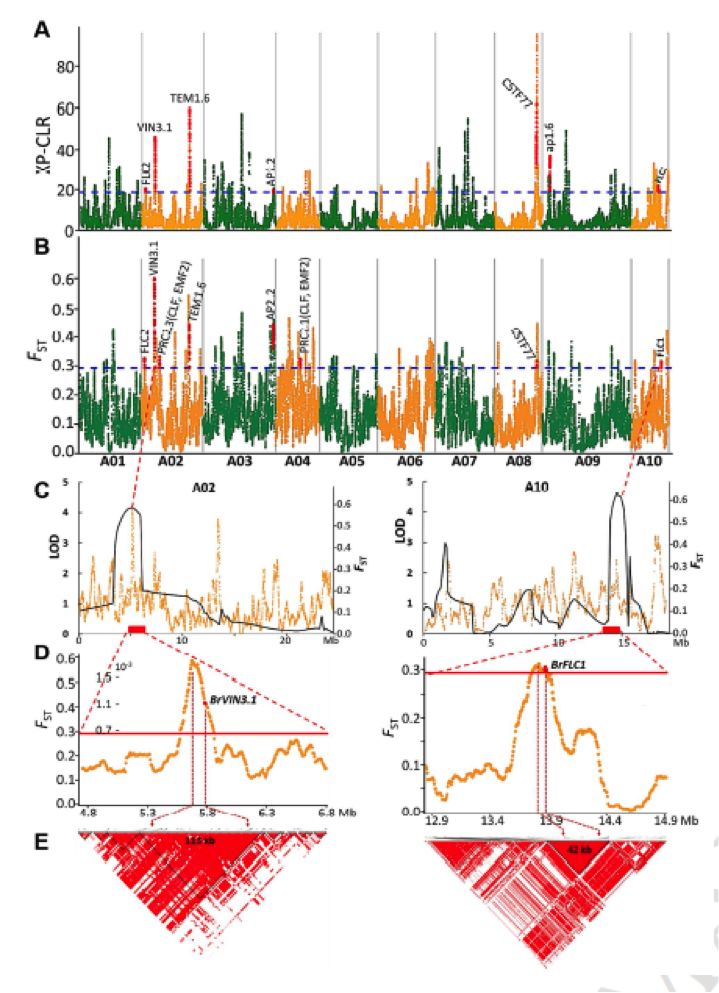 構(gòu)建了一個遺傳圖譜進行QTL定位以找到抽薹時間相關(guān)的區(qū)域,一共找到了7個QTLs,其中QTLs ftA02.1 and ftA10.1被發(fā)現(xiàn)在受選擇的兩個候選區(qū)域內(nèi)。通過多年對表型變化影響的反復(fù)檢測,推測它們參與了抽薹時間的調(diào)控。