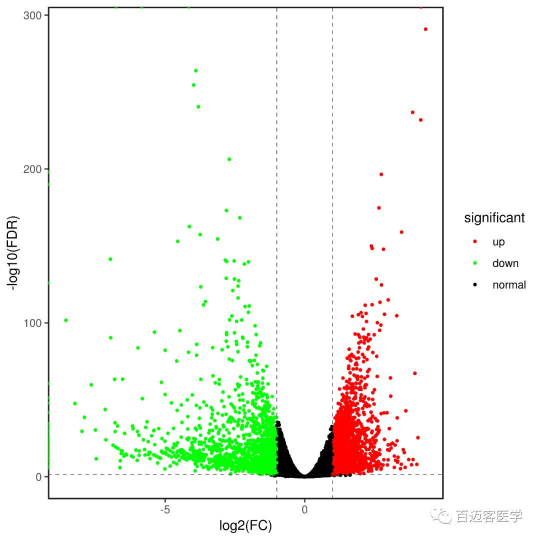 一個點表示一個基因, 橫坐標(biāo)表示某一個基因在兩樣品中表達(dá)水平差異倍數(shù)的對數(shù)值;縱坐標(biāo)表示FDR的負(fù)對數(shù)值。橫坐標(biāo)絕對值越大,說明基因在兩樣品間的表達(dá)水平倍數(shù)差異越大;縱坐標(biāo)值越大,表明差異越顯著,篩選得到的差異表達(dá)基因越可靠。圖中綠色的點代表表達(dá)下調(diào)基因, 紅色的點代表表達(dá)上調(diào)基因, 黑色代表非差異表達(dá)基因。