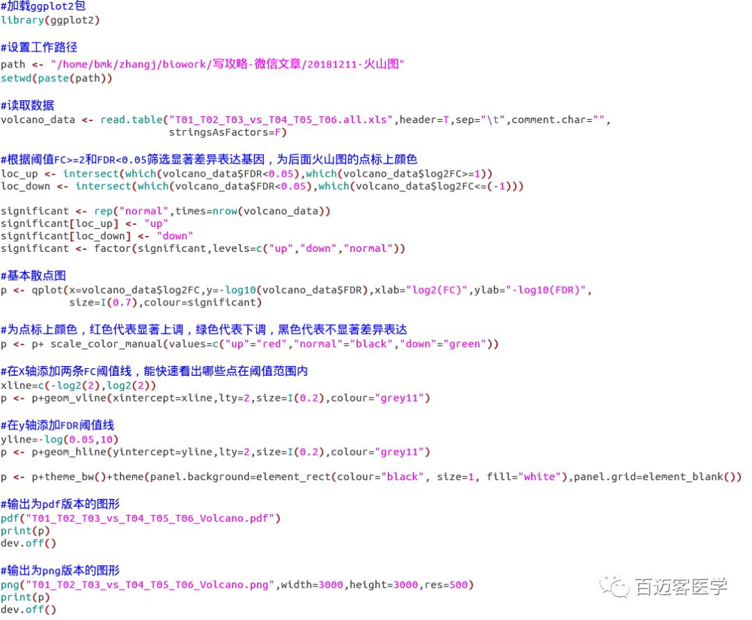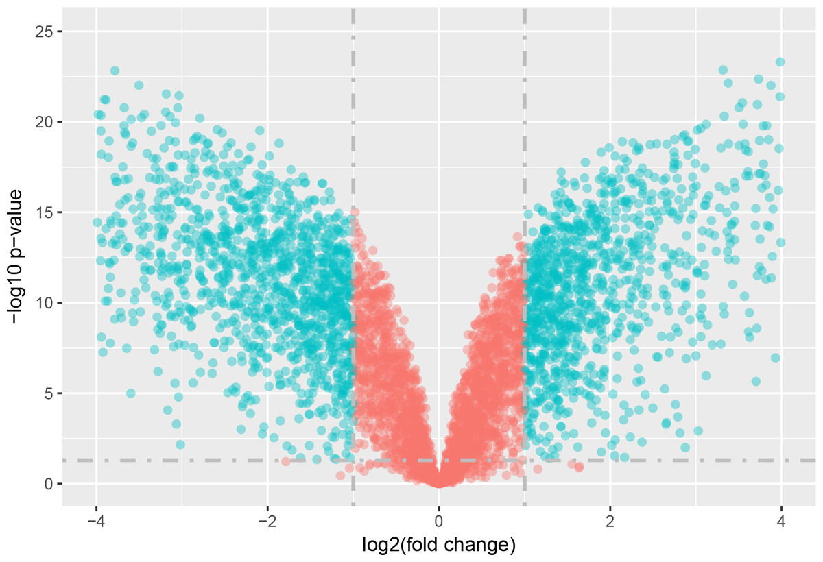 一般差異表達(dá)分析中會同時控制這兩個參數(shù)來篩選顯著差異表達(dá)基因,如取FDR<0.05和FC≧2?;鹕綀D可以直觀地展現(xiàn)所有基因的FDR與Fold Change之間的關(guān)系,以便快速查看基因在兩組樣品間表達(dá)水平的差異程度和其統(tǒng)計學(xué)顯著性?;鹕綀D的本質(zhì)其實就是散點圖。橫坐標(biāo)表示某一個基因在兩樣品中表達(dá)水平差異倍數(shù)的對數(shù)值,即log2(FC);橫坐標(biāo)絕對值越大,說明基因表達(dá)量在兩樣品間的倍數(shù)差異越大??v坐標(biāo)表示FDR的負(fù)對數(shù)值,即-log10(FDR)??v坐標(biāo)值越大,表明差異表達(dá)越顯著,篩選得到的差異表達(dá)基因越可靠。下面,小編就手把手教你如何繪制火山圖啦。
