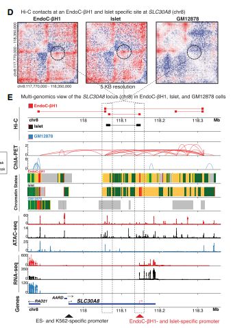 多組學(xué)分析結(jié)果在不同細(xì)胞中的比較。Hi-C互作表明在 EndoC-bH1 和人原代胰島SLC30A8位點(diǎn)有特異性loop,但在GM12878中缺乏。